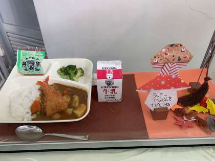 大人気メニューのカレーライスに、えびフライを添えた豪華メニュー★「えびフライとカレーって最高の組み合わせやな!!!」と大絶賛してくれている1年生児童がいました。