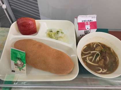 今日の給食は、カレーうどん、はくさいの甘酢あえ、りんご、コッペパン、ソフトマーガリン、牛乳でした。