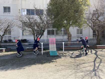 月曜日の朝会で、一輪車に乗る時のルールについてのお話がありました。
