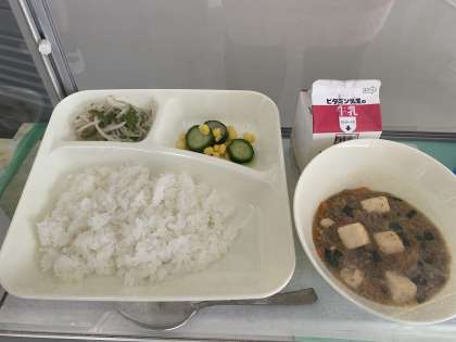 今日の給食は、マーボーどうふ、きゅうりとコーンの甘酢あえ、もやしとピーマンのごまいため、ごはん、牛乳でした。