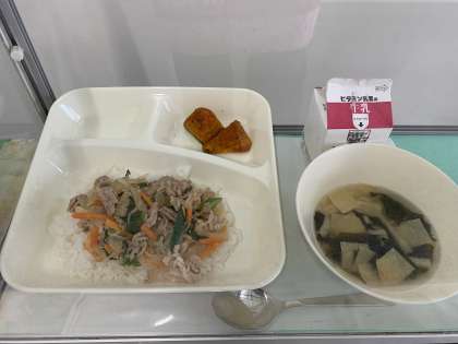 豚丼は、豚肉、糸こんにゃく、たまねぎ、にんじん、青ネギと具材がたっぷりで、とても食べ応えがありました。たくさん食べて、「お腹がいっぱい〜」という子もいれば、「まだまだ食べたい!お腹すいた〜」と言っている強者もいました。