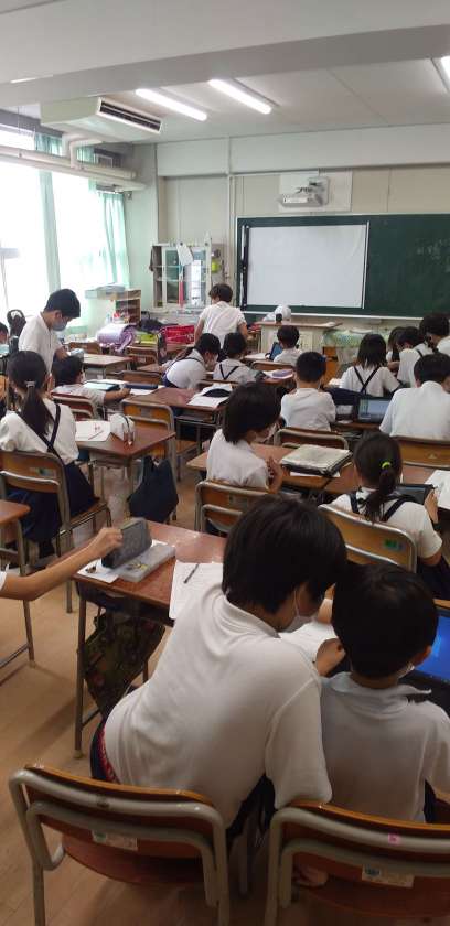6年生が1年生に学習者用端末の操作をアドバイスしています。