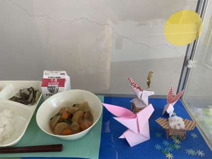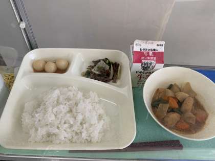 今日の給食は、月見の行事献立で、一口がんもとさといものみそ煮、牛肉と野菜のいためもの、みたらしだんご、ごはん、牛乳でした。