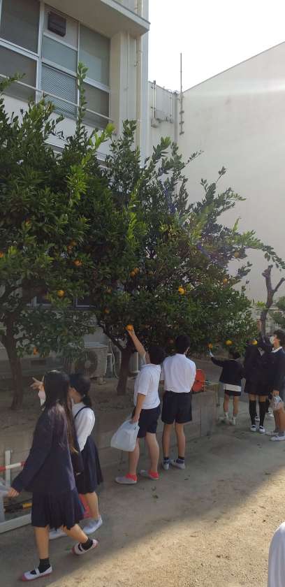 学校にあるみかんの木に、たくさんのみかんが生りました。