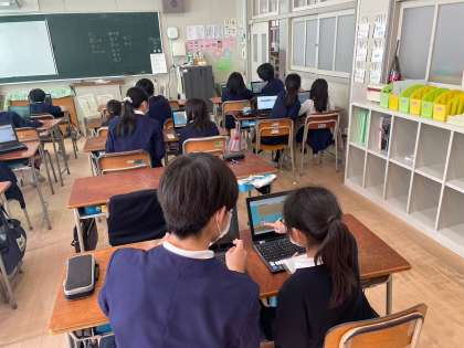 1年生のタブレットがChromebookに変わったので、今日は6年生が、まなびのポータルの基本操作などを教えています。