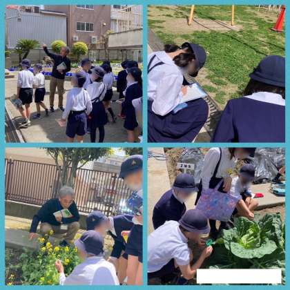 初めての理科の学習をしました。西九条小学校の生き物を探したり、植物を観察したりしました。みんな夢中になって観察しました。観察カードはうまく書けたかな?