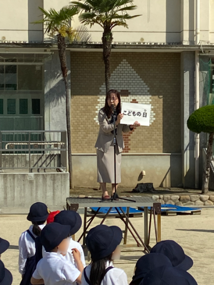 今朝の児童朝会はゴールデンウイークのお話を柳川校長先生がしてくださいました。「憲法記念日」「みどりの日」「こどもの日」という祝日の名前を教えてもらいました。