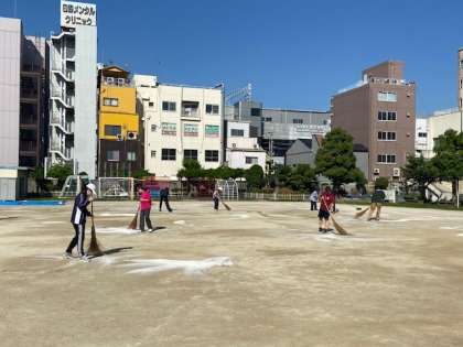 運動会の練習が運動場で始まっています。砂埃が舞うのを防止するために、教職員でにがりをまきました。