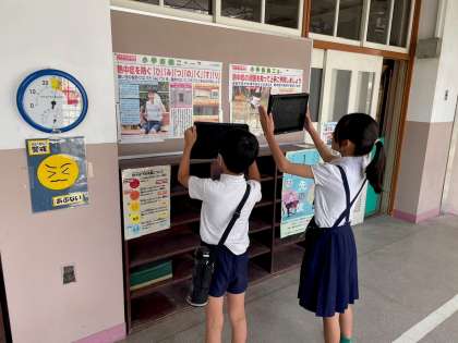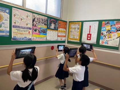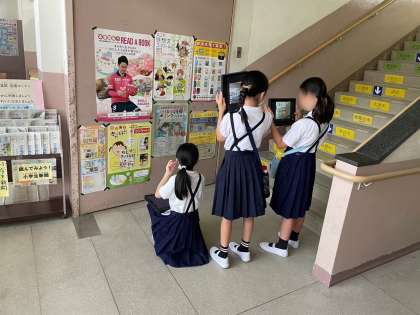 学校中のポスターを撮影しています。キャッチコピー、レイアウト、色づかい・・・作り手のいろんな工夫を見つけることができたかな?