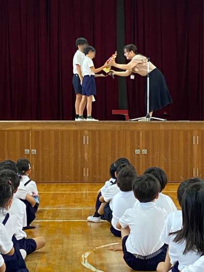 2.3年生にカナダから体験入学に来たお友だちの紹介がありました。1学期の最後まで西九条小学校にいます。