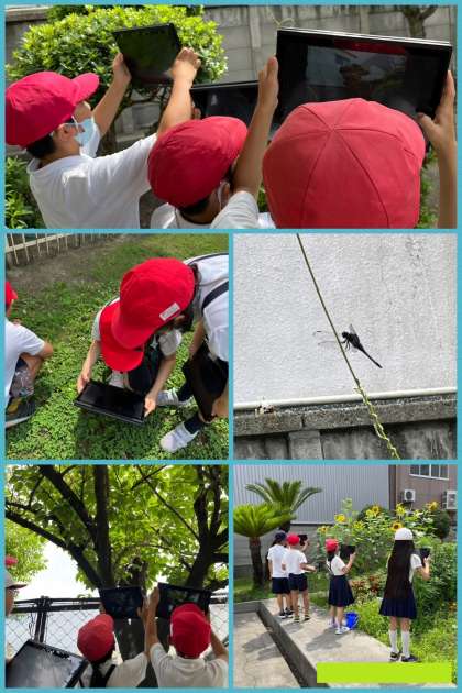 4年生が理科の学習で夏の生き物さがしをしています。トンボがいました。何トンボかな? みんな、一人一台パソコンの使い方が上手になってきました。