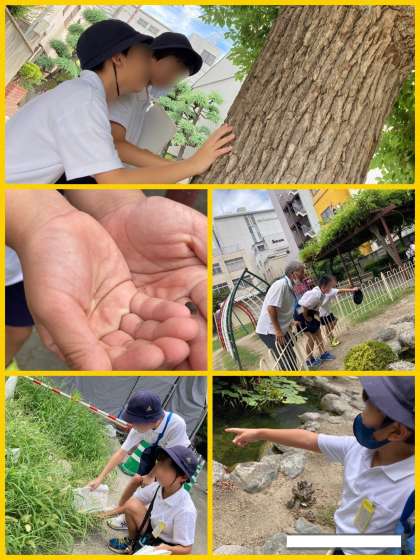 理科の学習で学習園周辺にこんちゅうを探しに行きました。池の上には、ヤゴの抜け殻がありましたよ。