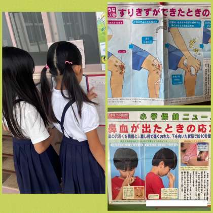 8・9月の保健目標は、「正しい手あらいをしよう」「けがをしないようにしよう」です。9月9日は救急の日。保健室には、けがの防ぎ方、けがをしたときの対処法などのポスターがたくさん掲示されています。みんなで、けがをしないように安全に過ごしましょうね。