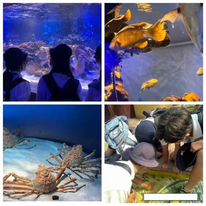 鳥羽水族館です。「いきもん」は不思議だな。美しい海洋生物に出会えました。アシカショーのアシカはかわいかったです。タッチプールでは、タッチできたと大騒ぎ!お昼ご飯は、ミールクーポンで各々食べているものが違います。おいしかった!