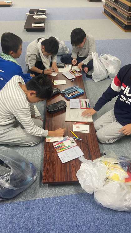 お風呂に入ってサッパリ。入浴後にハガキを書いています。誰に送るのかな?