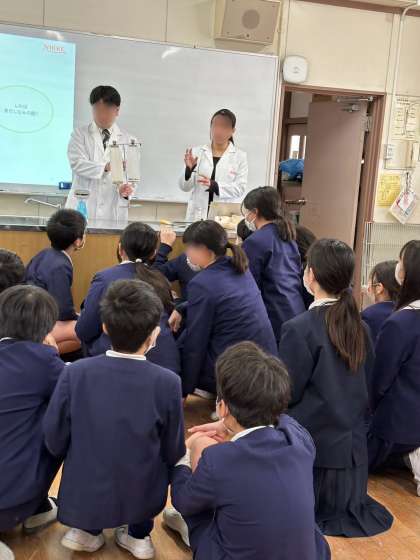 6年生、NIKKEの出前授業「ウールラボ」 ポリエステル・綿・ウールなど服に使われている色々な繊維について学習しました。糸の作り方や吸水性、難燃性についての実験をし、ウールでできている制服のお手入れ方法やSDGsに繋がる服の買い方などを学びました。