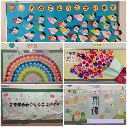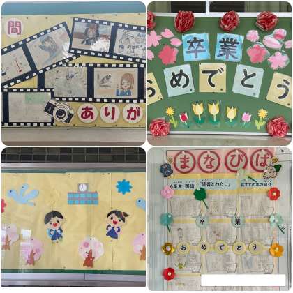 各学年、日本語教室、児童会、給食、図書館、3号階段、玄関、まなびばの掲示板です。みんなで6年生の卒業をお祝いです。