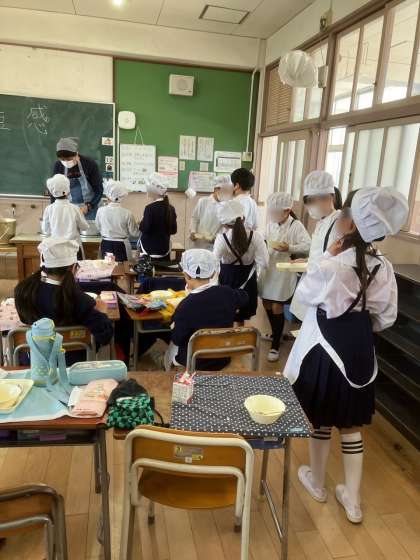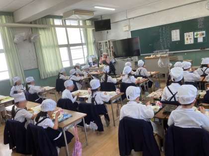 1年生が楽しく給食をいただいています。おいしいね。(写真左)