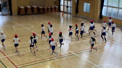 3年生が「20mシャトルラン」をがんばっています。20m間隔で引かれた2本のラインの間を電子音に合わせて、往復します。電子音はだんだん早くなっていきます。この測定で全身の持久性を調べることができます。