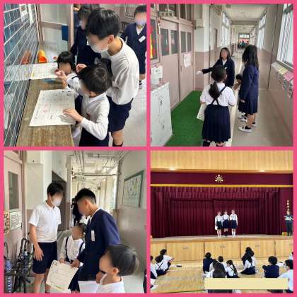 昨日の出来事です。1年生と6年生が学校たんけんをしました。「ここが、校長室だよ。」6年生がやさしく案内してくれます。1年生と6年生が仲良く手をつないで歩いている姿にほのぼのです。