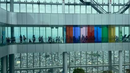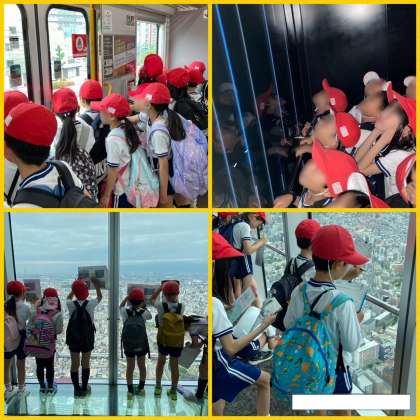 あべのハルカス60階からの眺望です。「あっ!通天閣や。」「遠くに大阪城見えてる。」「西の方は海やなあ。」「あれ、ヤンマースタジアム長居ちゃう?」(よく見つけたね。)3年生は、大興奮です。大阪市の町の様子がとてもよくわかりました。