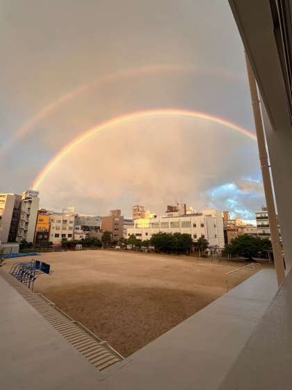 夕方、突然の雨・・・その後、なんときれいな虹が!! 肉眼では七色はっきり見えました。二重になっていたのもすごかったです。
