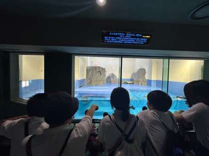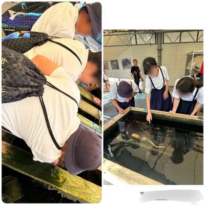 6年生は、鳥羽水族館に到着しました。海の生き物に歓声! 生き物を触って、興奮!!