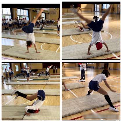 6年生の体育科マット運動では、開脚前転・跳び前転・開脚後転・伸膝後転・倒立前転・ロンダートなどの難しい技にも挑戦しています。