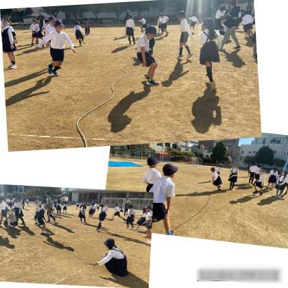 目標は、レベル1「ヘビ50回」、レベル2「くぐりぬけ30回」、レベル3「8の字とび20回」です。 休み時間に大なわとびで遊ぶ学年も増えてきています。