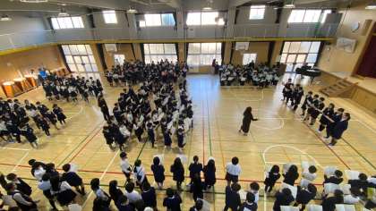 久しぶりの音楽朝会で「ぼくらのチカラ」を歌いました。前に10人の子どもたちが並んでいるの、お気づきですか? 6年生の「西九条ハーモニー合唱団」です。