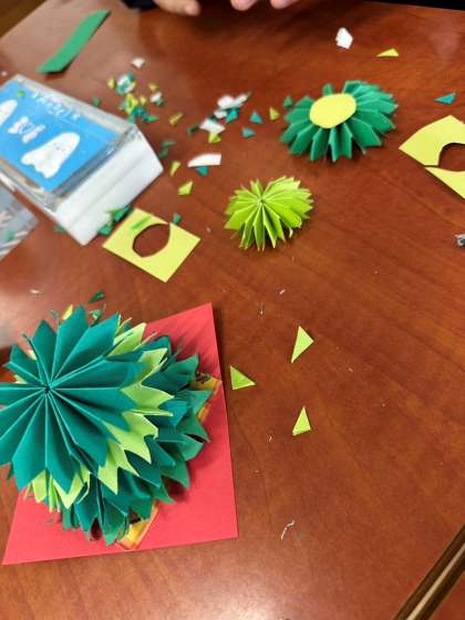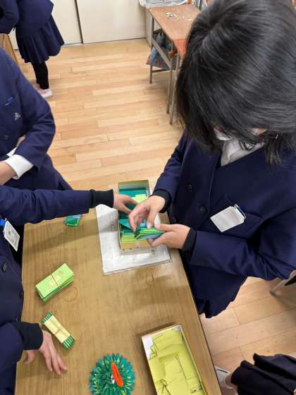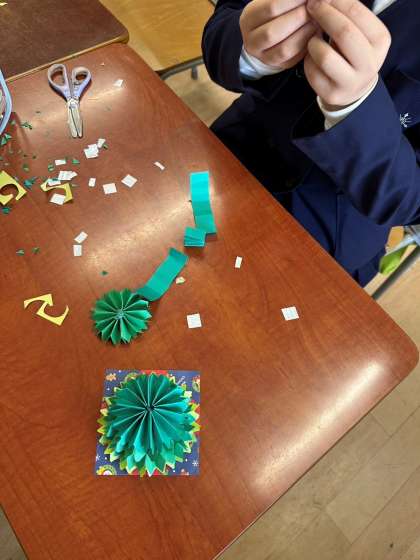 6年生は、図画工作科でクリスマスツリーを製作中です。画用紙をジャバラに折って、立体的なツリーを作っていきます。