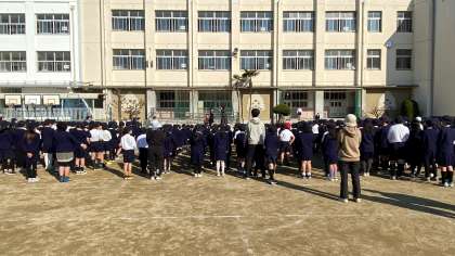 久しぶりの運動場での児童朝会でした。春の訪れを感じますね。校長先生が玄関にようやく梅の花が咲いたよと教えてくださいました。