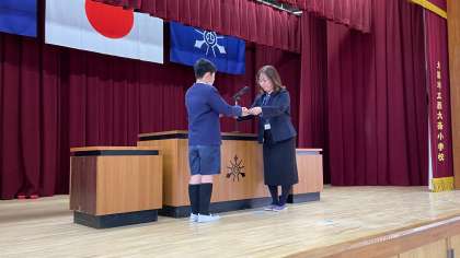 修了式がありました。5年生の代表に修了証が渡されました。1年生、4年生の代表の作文を聞きました。1年生は、プールをがんばったこと、みかん狩りで6年生がみかんをとってくれたことを話してくれました。4年生は、ジュニアに入ってサックスが吹けるようになったこと、参観で「二分の一成人式」をしたことを話してくれました。