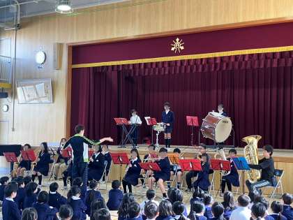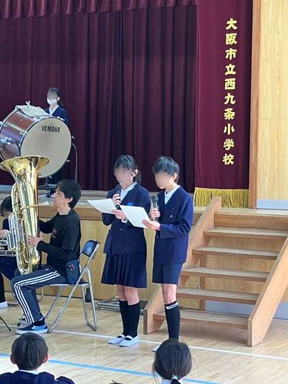 今朝の児童朝会で、西九条ジュニアウインドオーケストラが体験会の告知をしました。現在、ジュニアは5・6年生15名で活動しています。