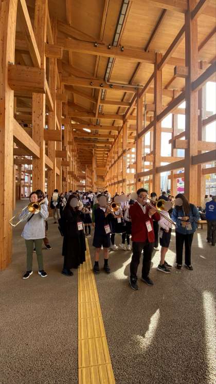 大屋根リングの下を行進しながら演奏するという貴重な経験ができました。マーチングの後は、日本の心の曲「ふるさと」も演奏しました。