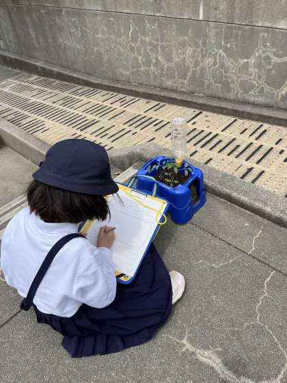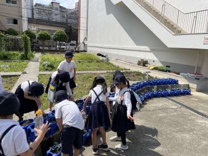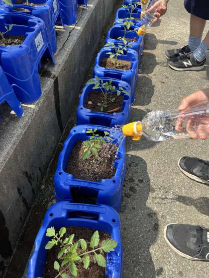 2年生の生活科の学習で、ミニトマトを育てています。「大きくなあれ!元気になあれ!」と言いながら、水やりをしていました!
