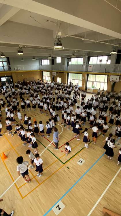 今朝の児童集会は、「言うこと反対ジャンプ」というゲームでした。集会委員会さんが「前!」というと後ろに、「右!」というと左にジャンプしないといけません。