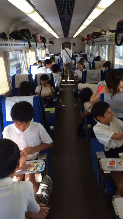 電車の中、カードゲームで盛り上がってます。