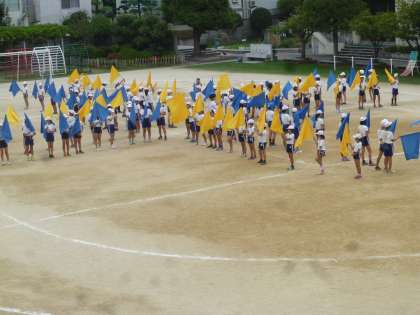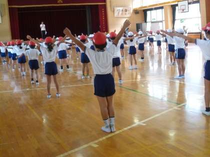 14日の運動会にむけて、どの学年も練習にはげんでいます。今日は雨模様で、運動場での練習はできませんが、ここ数日の1年生と6年生の様子をお届けします。