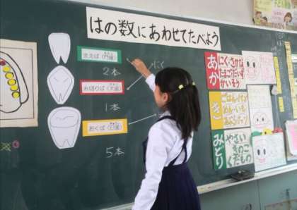11月8日のいい歯の日にちなんで、人の歯と食事バランスのひみつをさぐる授業がありました。肉を1口食べると、野菜はその2倍、ごはんなどの主食や豆類は、さらに4から5倍食べるようにすると、バランスのよい食事になることを、前歯、糸切り歯、奥歯の本数の割合から、学びました。子どもたちは「はじめて、歯と食事のことを知った。バランスのよい食べ方をしていきたい。」などの感想や目標を発表しました。