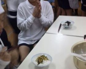 炊きたてのご飯に、すきなふりかけをかけていただきました。意外にも一番人気は、栄養教諭手作りのみそだれ(八丁味噌、みりん、砂糖、ごま油、ケチャップで作ったもの)でした。おかわりをする児童が並んでいました。