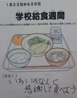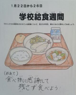 24日の給食記念日にちなんで、今週は西九条小学校の給食週間です。児童朝会では、校長先生から「毎日390人分くらいの給食を、4〜5人の給食調理員さんが作ってくださっています。みなさんは、感謝して残さずに食べていますか。」というお話がありました。廊下などには、健康委員会の児童が作成したポスターが掲示されています。木曜日には、児童集会で健康委員会の給食・食育クイズもあります。お楽しみに。