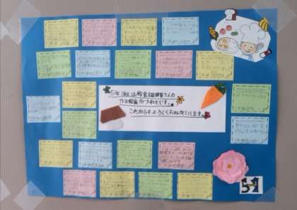 「ラッキーにんじんがいつも楽しみで、わくわくしています。ありがとうございます。」「カレーが大好きです。毎日おいしい給食をありがとうございます。」など、児童から心温まる感謝のメッセージが給食調理員さんへ贈られました。教室近くの階段付近に掲示していますので、明日の土曜参観時にぜひご覧ください。