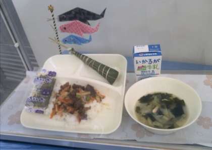 ちまきや牛肉のきんぴらちらしなど、子どもの日をお祝いする行事献立がでました。1年生では、半分以上の児童がはじめてちまきを食べました。「これなに?どうやってむくの?」と初メニューにドキドキ。慣れなくて減らしてほしいと申し出る児童も多くいましたが、「おいしかったからおかわりしたよ」とうれしそうに教えてくれる児童もありました。日本の四季折々の行事献立を、給食で提供し、和の心・日本を愛する思いを子どもたちに持ってほしいと願っています。