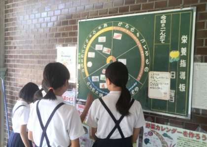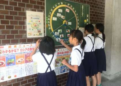 6月は食育月間です。健康委員会の児童が「食べものの命や作ってくれる人に感謝して残さずにマナーよく食べましょう」と放送し、自分からよい姿勢などを実践してクラスにも広めるように呼びかけたり、給食室前の栄養ボードに記入したり、地味な取り組みですが頑張っています。