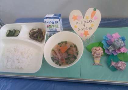 早朝にふった雨がうそのように晴れて、プールには歓声が上がっていた今日、給食のメニューは「チンジャオニューロウスー」でした。中華スープにハートの形のラッキーにんじんが入っていました!昨日1年生の児童が給食調理員に「次のラッキーにんじんはいつあるの?」とたずねていましたので、リクエストに答えて実施してくださったのです。