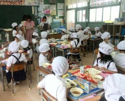 1年生の教室では、当番の児童が今日の給食カレンダーを読んでいました。クイズが大人気で、子どもたちは喜んで食育の学習をしています。