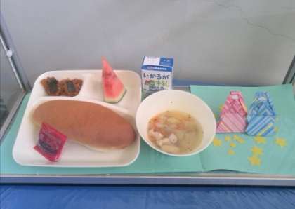 今日は、年に1度の「すいか」が出ました。給食室前のサンプルディスプレイには、「おりひめとひこぼし」が飾られていました。大きなすいか1つを64等分に切り分け、400人分を用意するのは、たいへん気を使う作業ですが、とってもきれいにカットし、大バットに並べていただきました。