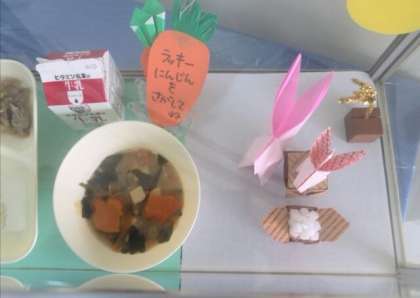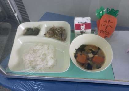 秋をイメージして、みそ汁の中にリスやうさぎの形のラッキーにんじんが入っていたので、1年生の子どもたちは大喜びでした。なんと、今日はおかずの残りがほとんどなく、とてもよく食べていました。