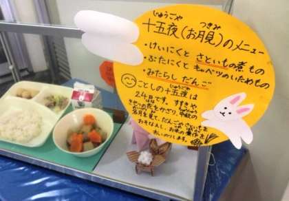 今日の給食は、鶏肉とさといもの煮もの、みたらしだんごなどの月見の行事献立でした。今年の十五夜は24日ですが、行事献立は少し早目の実施となりました。